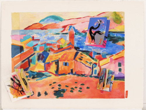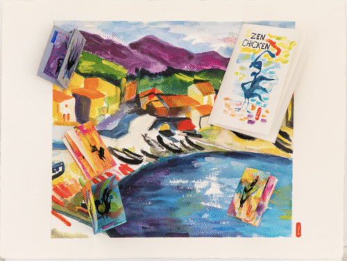 Watercolor homage to Charles Camoin's 1005 Fauve painting with Zen Chicken zines applied to the surface. 22 x 30 inches, 2026