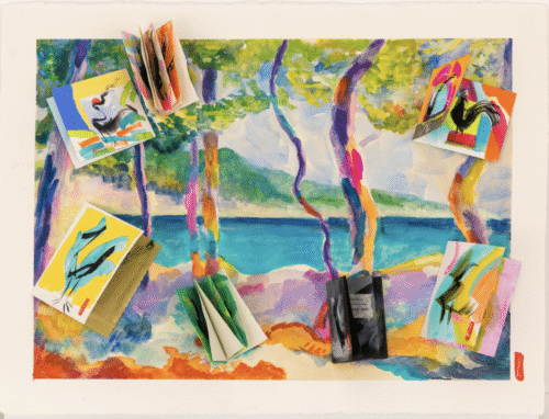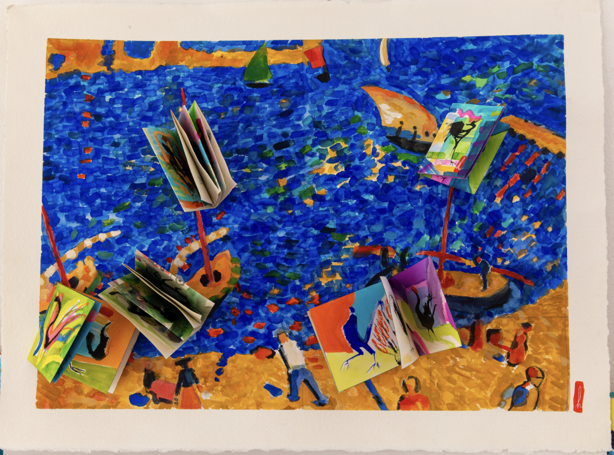 Watercolor homage painting from Henri Manguin 1905 Fauve period with Zen Chicken zines attached. 22 x 30 inches, 2026