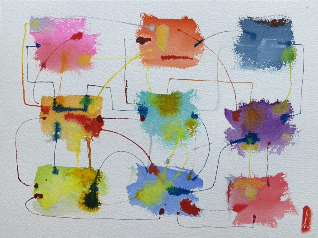 Watercolor and ink painting of color blocks connected by ink lines. 12 x 16 inches on 300 lb Arches paper.